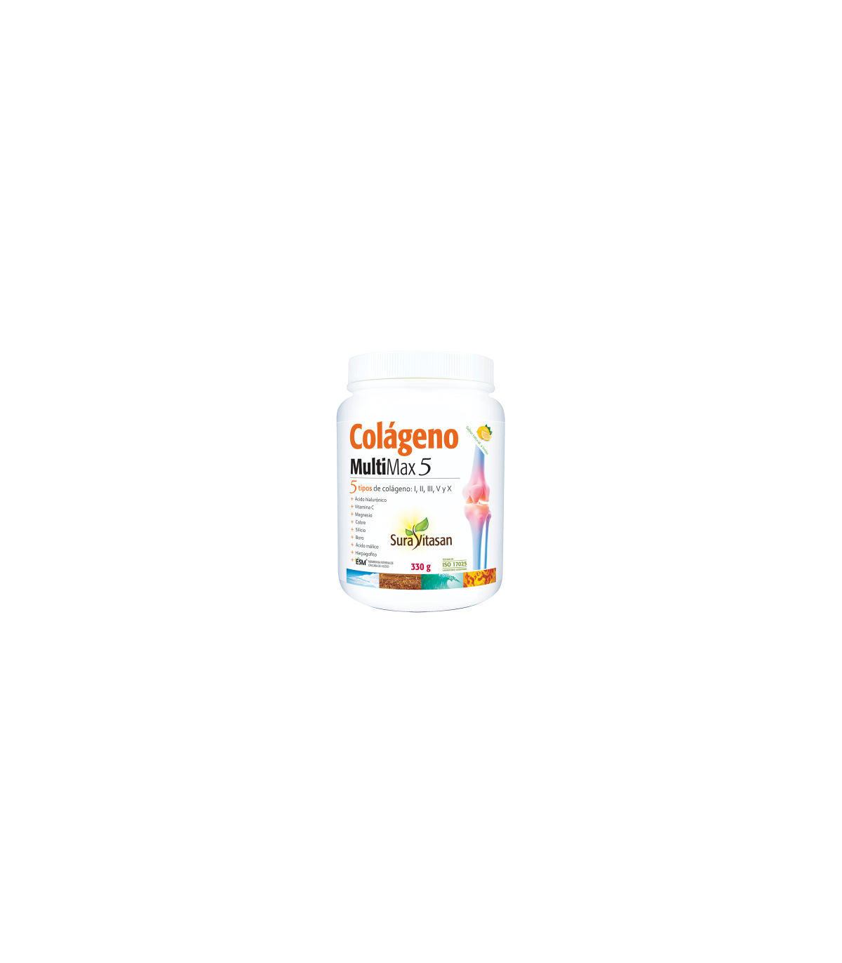 Colágeno MultiMax 5 de SuraVitasan es una fórmula sinérgica diseñada para la salud osteoarticular, que además de aportar 5 tipos de péptidos de colágeno bioactivos distintos, también aporta membrana interna de cáscara de huevo (ESM®), ácido hialurónico, harpagofito, vitamina C, minerales específicos y ácido málico.